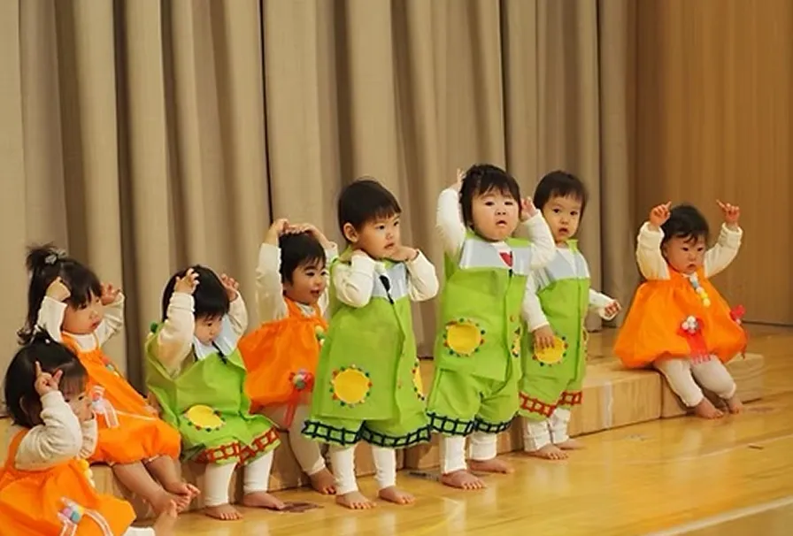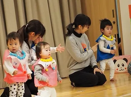 子ども達は自分で作ったきらびやかな衣装を身にまとい、大勢の観客の前に立ち、日ごろの遊びや生活の様子を合奏・歌・手遊びやダンス、劇などのリズム遊びで表現し堂々と発表します。子ども達がリズムにのって楽しむ姿や、リズムに合わせて音を鳴らす楽しさ、友だちと学年全体で一つの曲を作り上げ音を合わせる心地良さや演奏する喜びを感じることができます。キラキラ輝いた子ども達の姿に感動で胸がいっぱいになります。